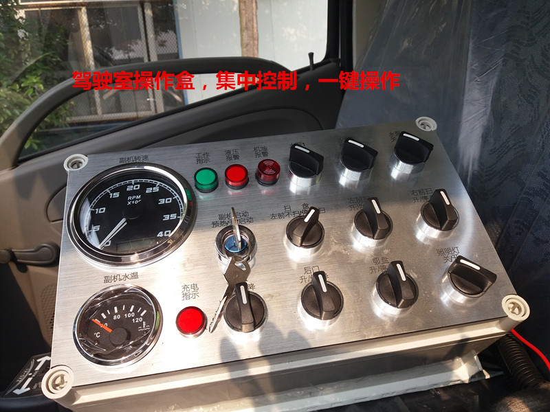 上裝標(biāo)配:帶4個(gè)掃盤、萊恩31馬力副發(fā)動(dòng)機(jī)、三洋馬達(dá)、施耐德控制開關(guān)、海普瑞斯電磁閥組、無級(jí)變速自動(dòng)離合器、免維護(hù)離心式自動(dòng)風(fēng)機(jī)、不銹鋼垃圾箱、中聯(lián)北極星電子水泵,尾部LED箭頭指示燈、手動(dòng)泵應(yīng)急系統(tǒng)、垃圾舉升自卸功能。