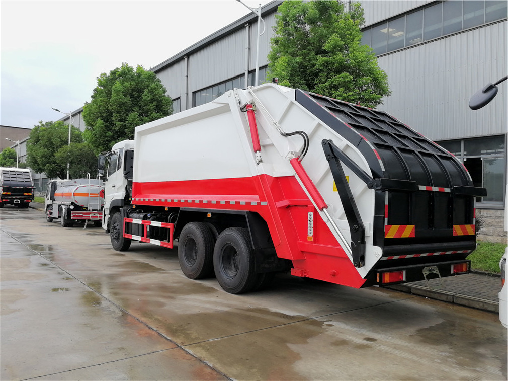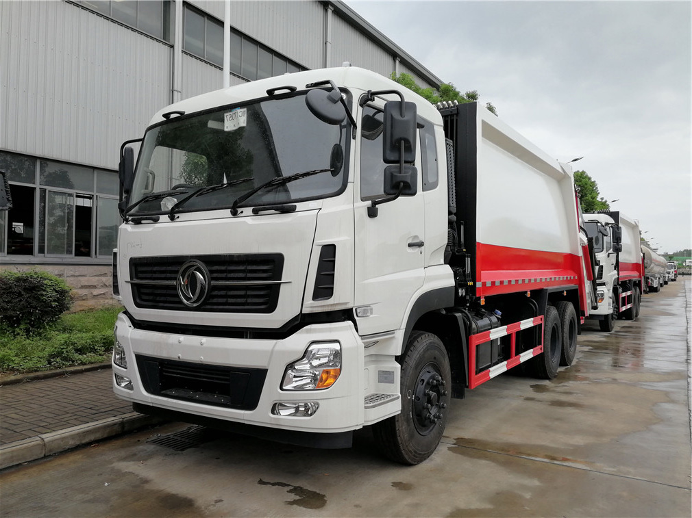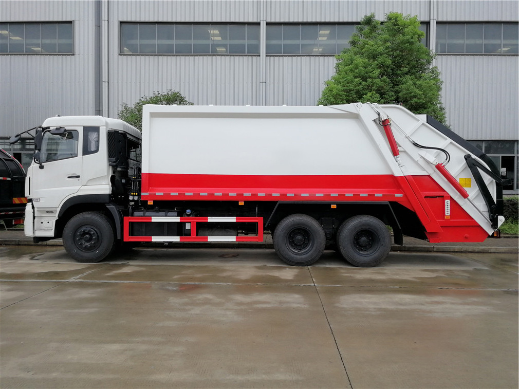 天龍壓縮式垃圾車,采用新款無筋條箱體,Q235碳鋼焊接而成,平面圓弧美觀大方,外形尺寸:9980×2500×3300mm,壓縮容積為16方,為布袋翻轉上料機構,電控手動雙操控器,駕駛室與車尾部雙控制箱,尾部帶3mm厚的橡膠密封壓條,帶污水收集槽,大容量污水箱,壓縮式垃圾車由密封式垃圾廂、液壓系統、操作系統組成,為全密封型,自行壓縮、自行傾倒、壓縮過程中的污水全部進入污水廂,較為徹底的解決了垃圾運輸過程中的二次污染的問題。